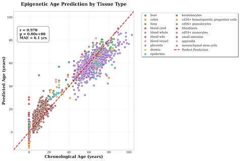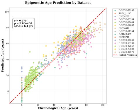 Pearson ≈ 0.958; MAE ≈ 11.6 yr