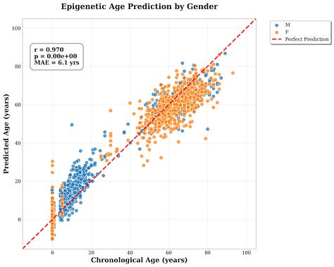 Mean Pearson ≈ 0.969; MAE ≈ 6.0 yr